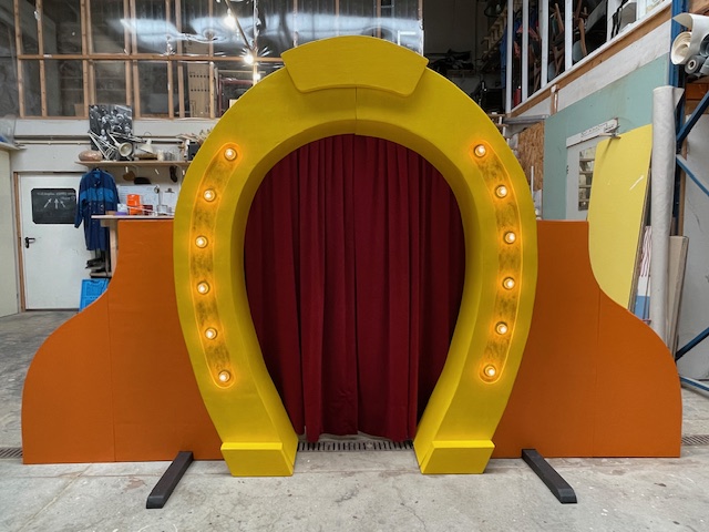 Hoefijzer-decor Voor een nog te spelen voorstelling maakte ik dit Hoefijzer-decor. Demontabel, zonder gereedschap door 1 persoon op te zetten. Windproof want bestemd voor een overkapte voorstelling in de openucht. Binnenkort meer info en foto’s ter plekke.